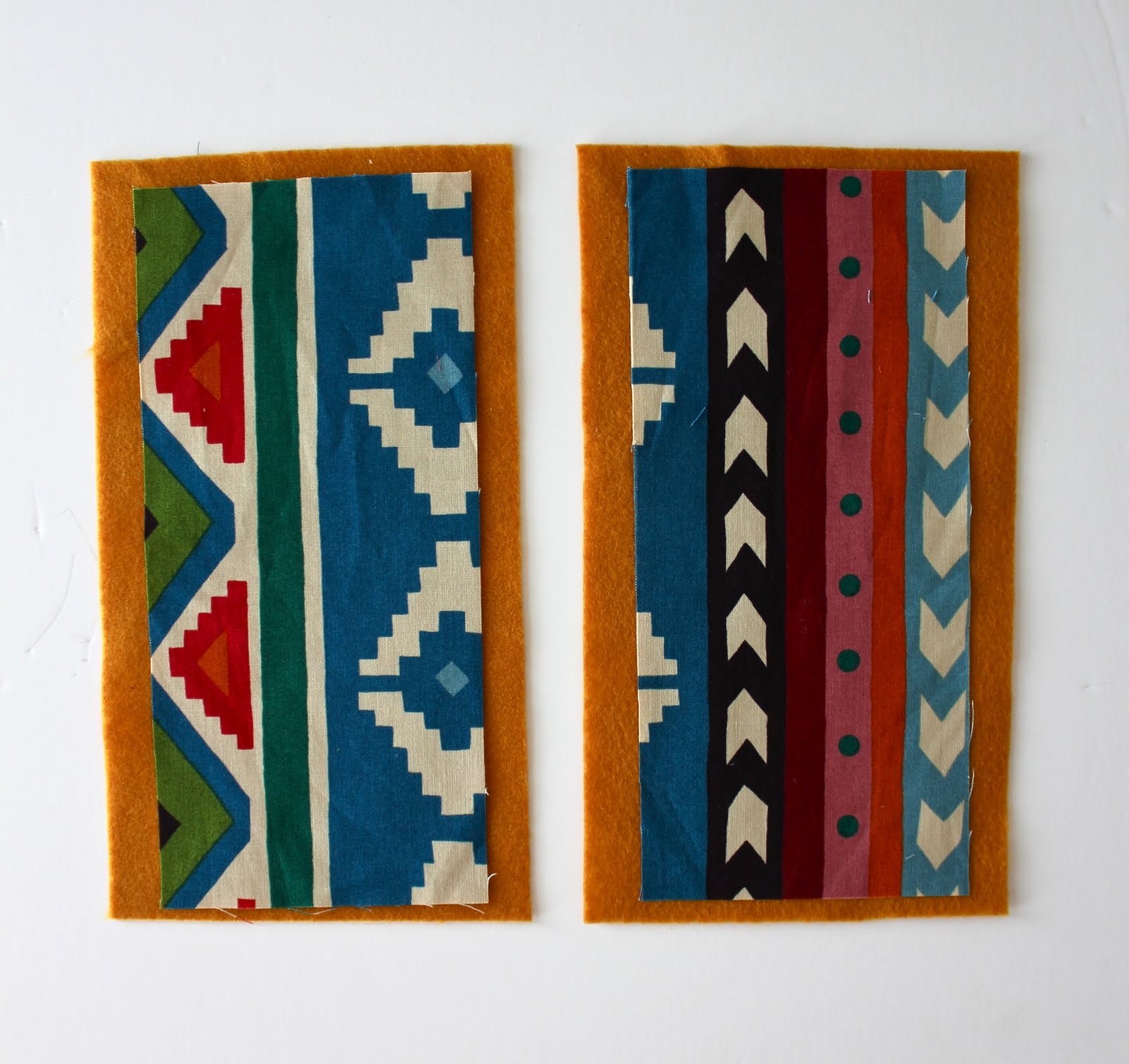 Cut your sheet of felt in half and lay a section of fabric on each.