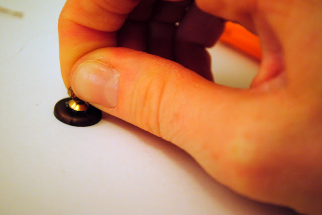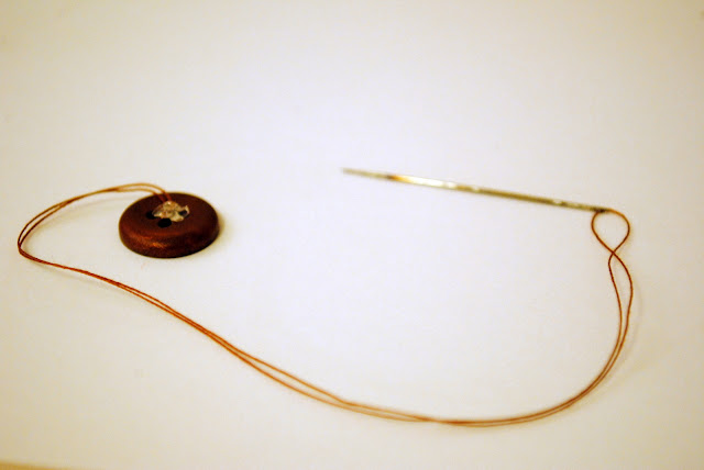 Thread your needle and using a tiny dab of glue, glue the knotted end of the thread to the middle of the button. Bring the thread through the buttonholes in whatever fashion you prefer; I made an X with the thread. Thread through a few times so you have a nice noticeable thread in your buttonholes.