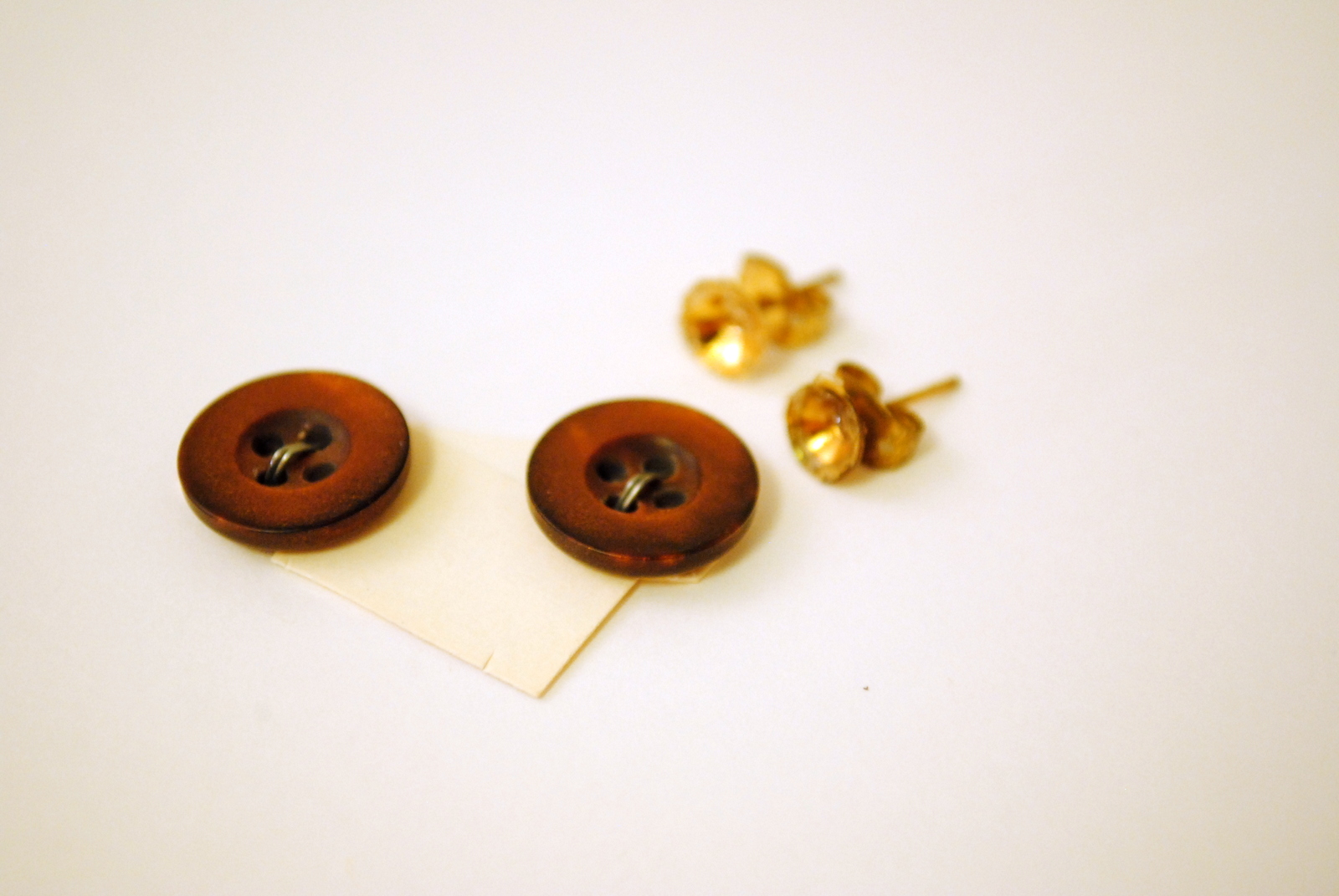 Snip the end of the thread. Place a dab of glue onto the earring back and, being sure to catch ends of thread underneath, press earring back firmly onto the button. Repeat steps with other button.