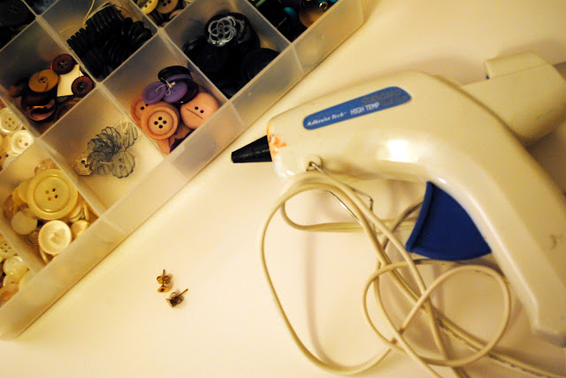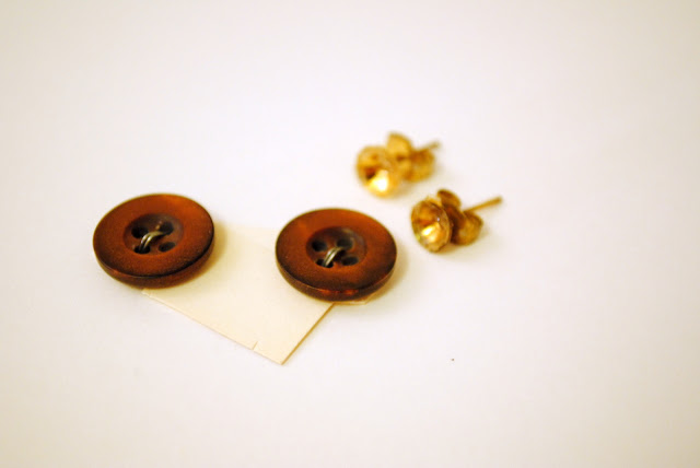 You will need two buttons (they don’t even have to match!), a glue gun (or regular craft glue if you have more patience than me), two earring backs (found at craft stores), and a needle and thread.