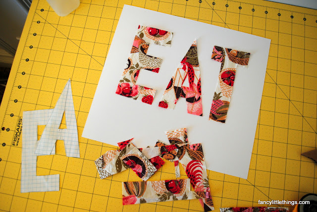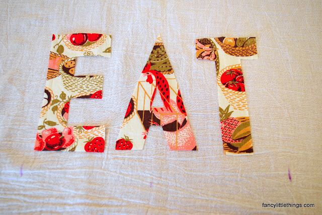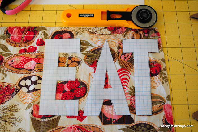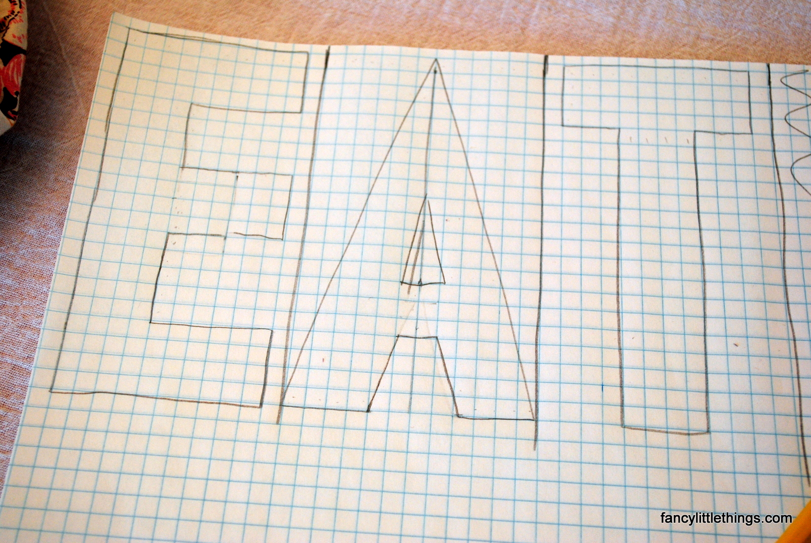 Cut out graph paper letters and place on fabric where you want them. My brother got me this great vintage fabric for Christmas. This is a perfect opportunity to use it!